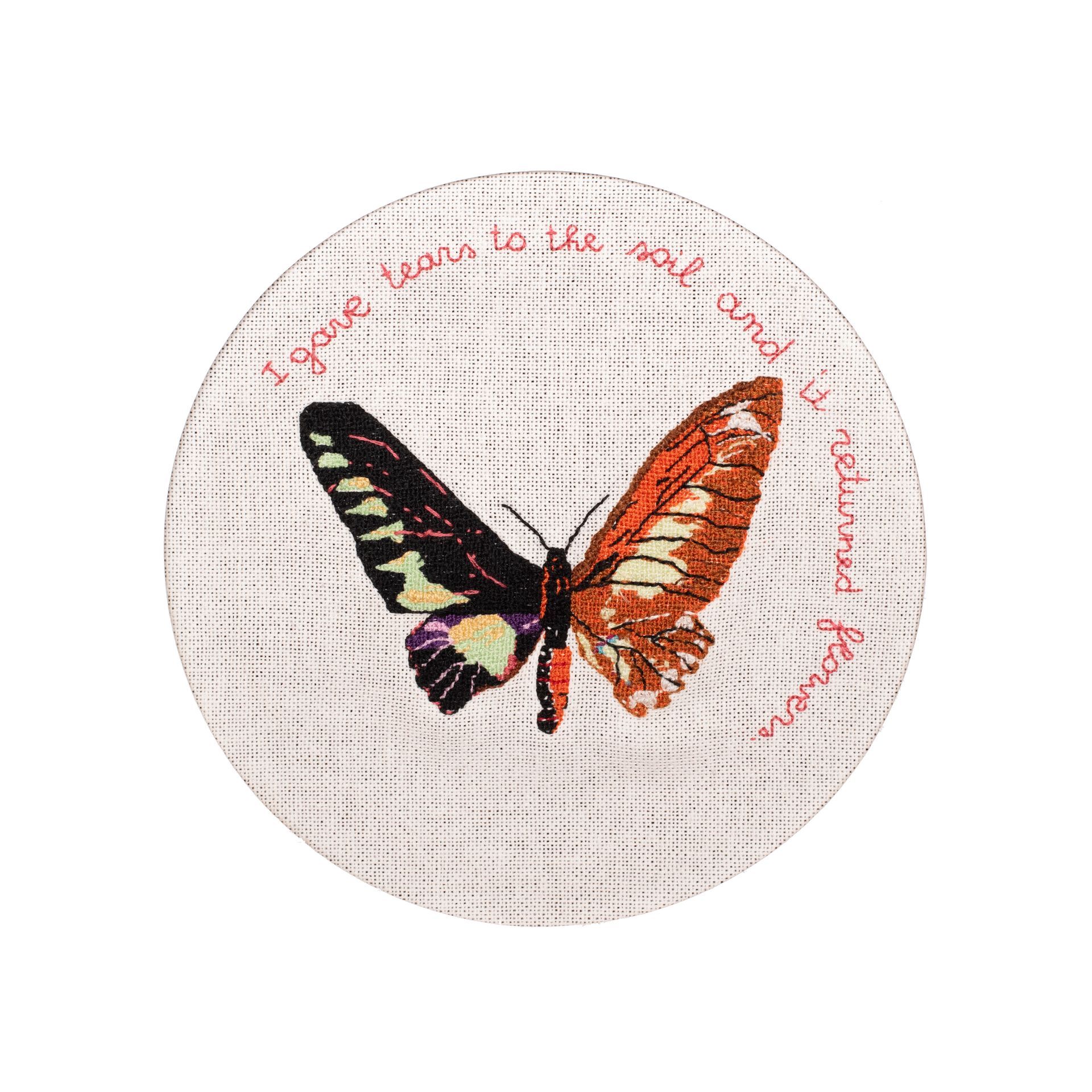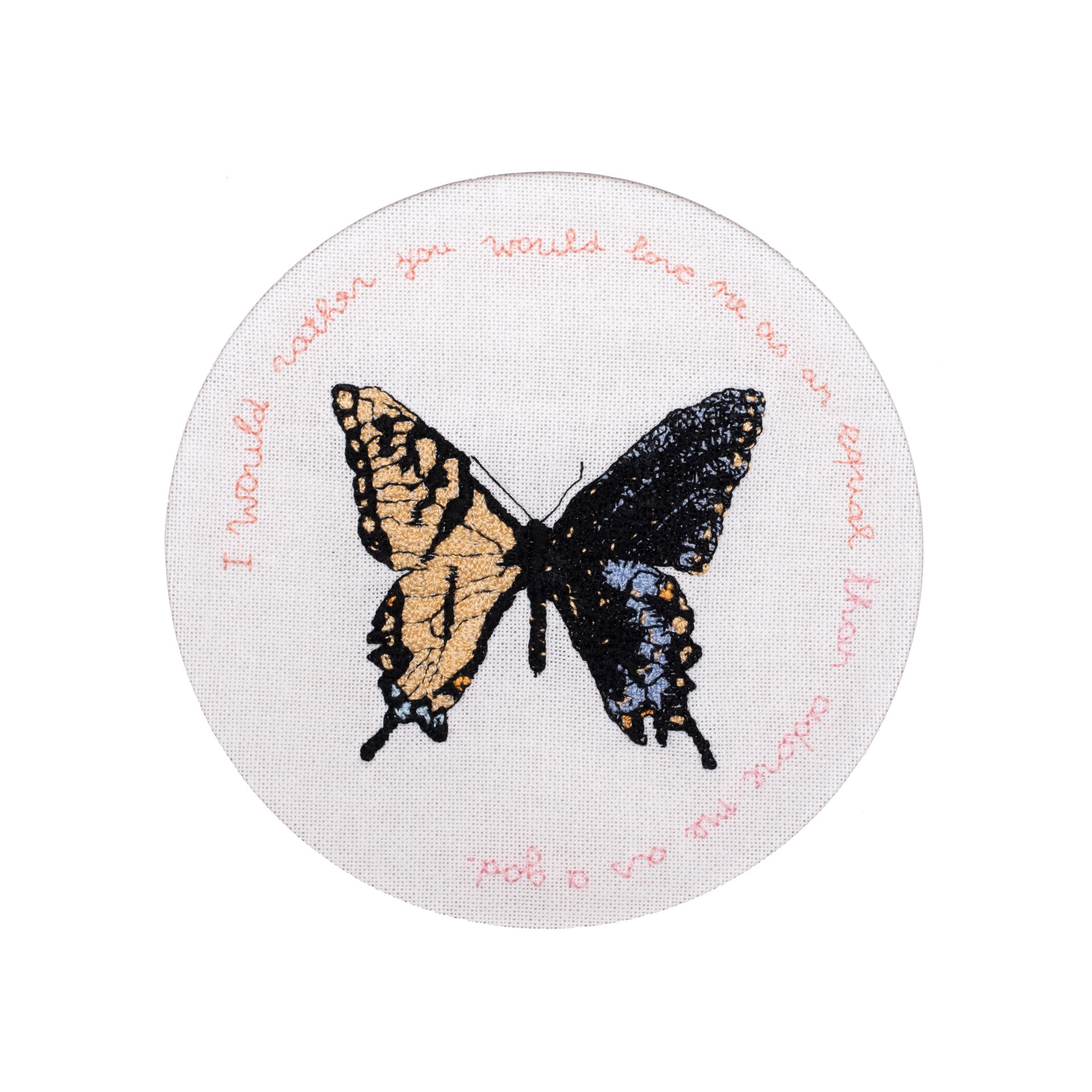 “My collection” (2024-ongoing) brings together a series of embroideries made by the artist. They portray bilateral butterflies, which have a symmetrical